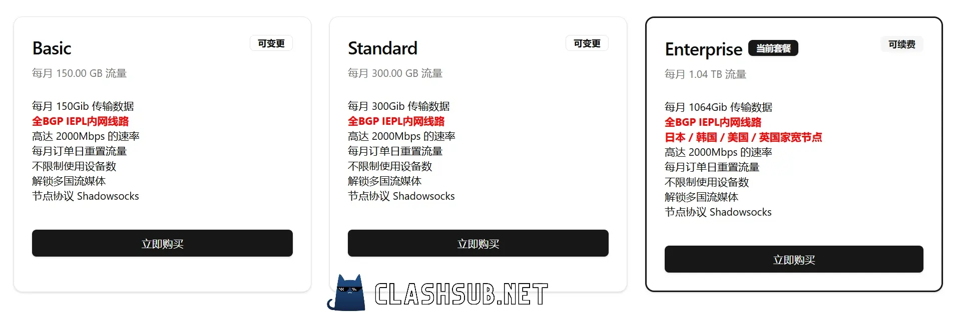Enterprise 套餐¥150 每月,包含 1.04 TB 周期性流量。包含更多家宽节点。