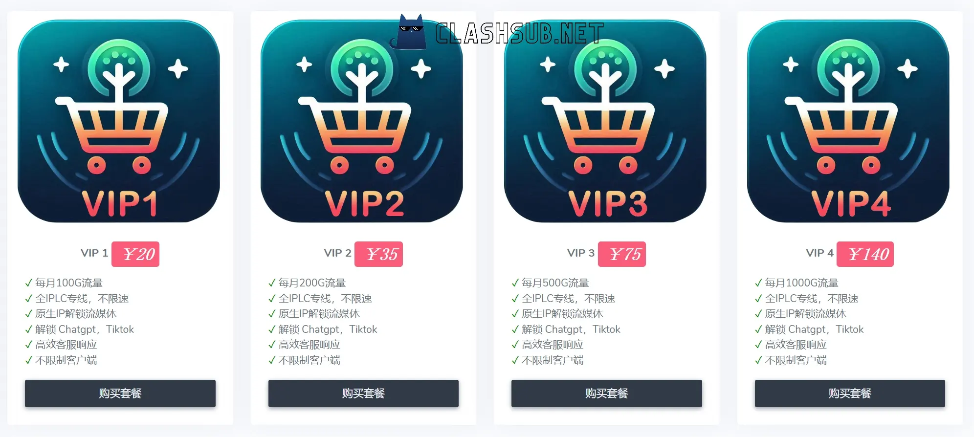 五树云机场套餐支持月付,最便宜的套餐为每月 ¥20 元 100G 流量每月的 VIP1 套餐。套餐选择季付、半年付、年付均有一定幅度优惠。