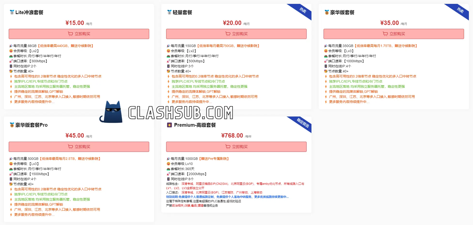 守候网络机场最低月付 15 元。Premium 套餐有更多独享入口和线路可用。