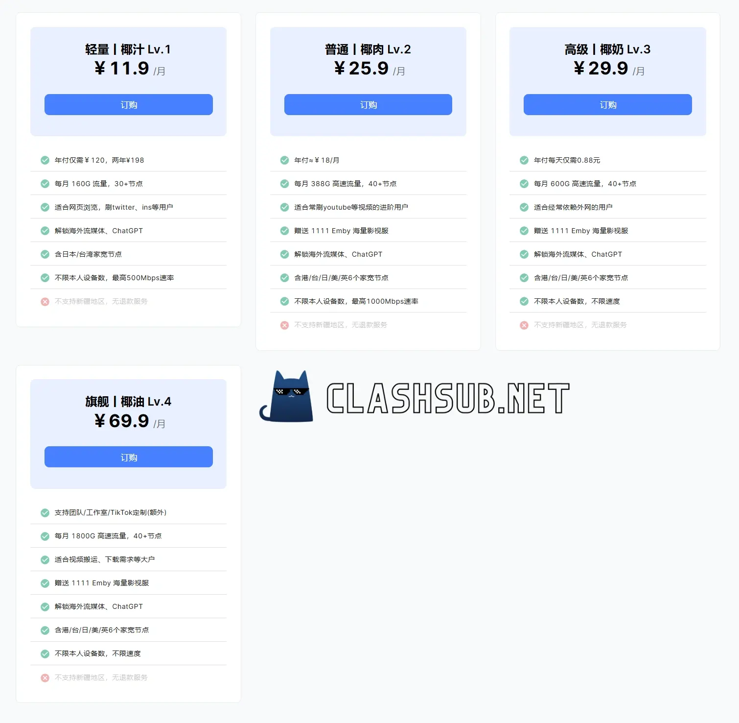 - LV4 MAX:¥59.9/月,600G流量/月。40+节点。